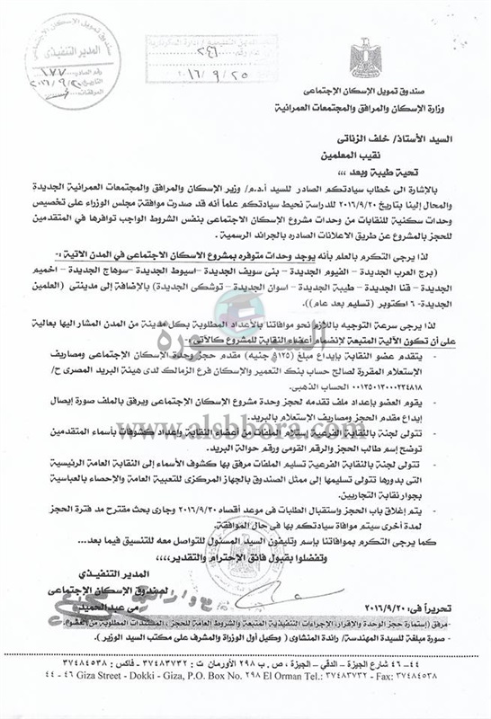 سكنية لأعضاء النقابة من وحدات مشروع الإسكان الاجتماعى بنفس الشروط الواجب