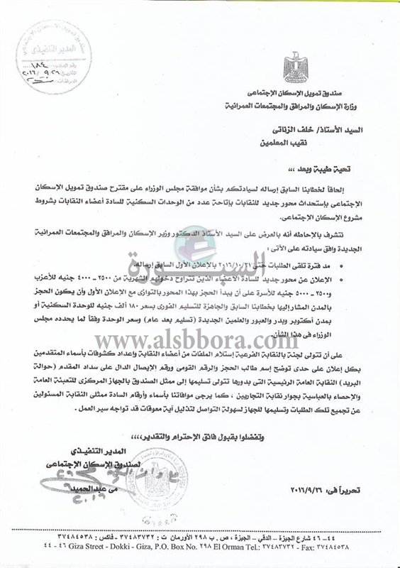 النقابة بمشروع الإسكان الاجتماعى فى المدن الآتية : " برج العرب الجديدة –