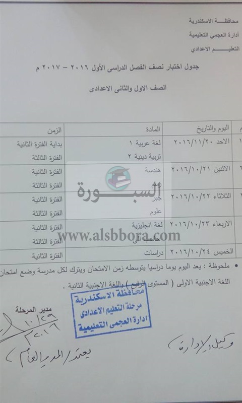ينشر موقع السبورة جدول اختبار نصف الفصل الدراسى الأول 2017/2016 لادارة العجمى التعليمية التابعة لمديرية التربية والتعليم بمحافظة الاسكندرية.