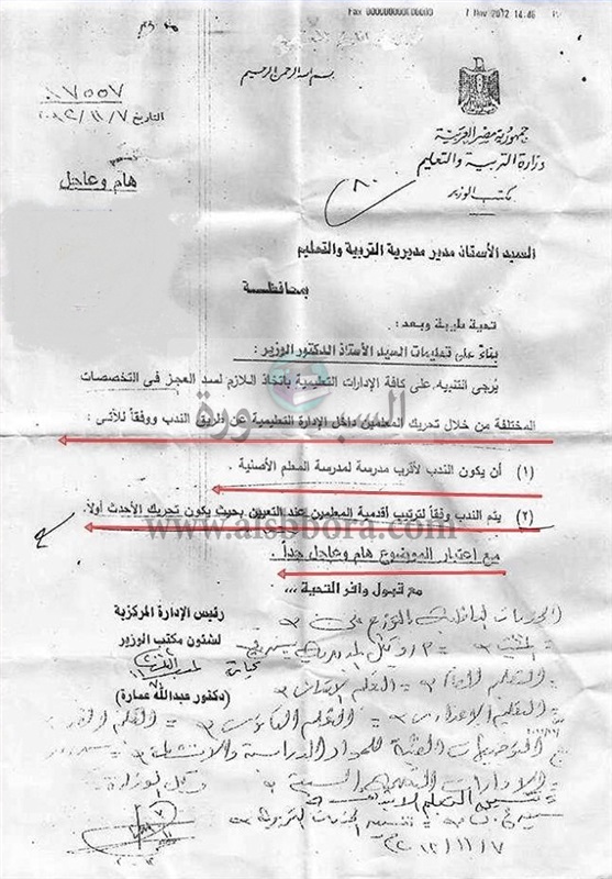 ارسلت وزارة التربية والتعليم فاكسا الى جميع المديريات التعليمية بشأن ندب المعلمين والشروط والقواعد الواجب اتباعها مع المعلمين، حيث جاءت كالتالى: