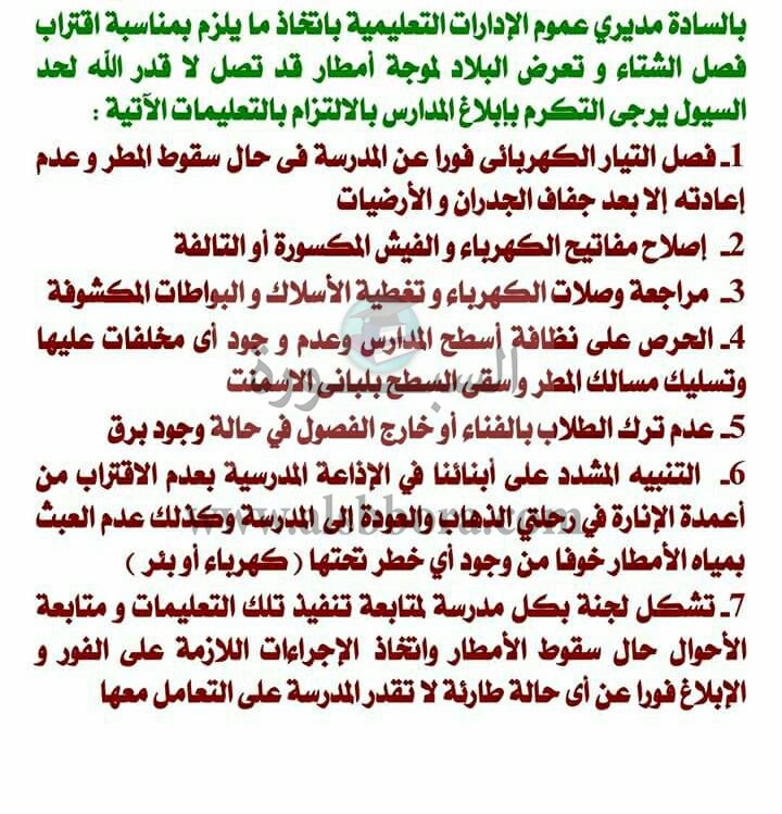 شددت وزارة التربية والتعليم والتعليم الفنى على جميع مديرى المدارس بمناسبة قرب فصل الشتاء وهطول الأمطار والسيول المتوقع فى المحافظات النائية أن تتبع التعليمات التالية للمحافظة على حياة التلاميذ والمعلمين، والتى جاءت كالتالى: