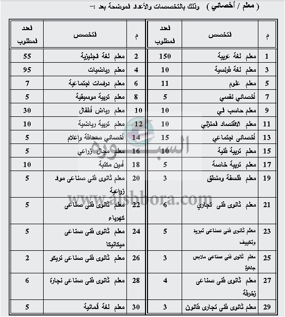 معلم لغة عربية، معلم لغة انجليزية، معلم لغة فرنسية، معلم رياضيات، معلم علوم، معلم دراسات اجتماعية، أخصائي نفسي، معلم تربية موسيقية، معلم حاسب الي، معلم رياض أطفال، معلم الاقتصاد المنزلي، معلم تربية رياضية، أخصائى اجتماعي، أخصائي صحافة وإعلام، معلم تربية فنية، معلم مجال زراعي، معلم تربية خاصة، أمين مكتبة، معلم فلسفة ومنطق، معلم ثانوى فنى صناعى مواد زراعية، معلم ثانوى فنى تجاري، معلم ثانوى فنى صناعى كهرباء، معلم ثانوى فنى صناعى تبريد وتكييف، معلم ثانوى فنى صناعى ميكانيكا، معلم ثانوى فنى صناعى ملابس جاهزة، معلم ثانوى فنى صناعى تريكو، معلم ثانوى فنى صناعى زخرفة، معلم ثانوى فنى صناعى نجارة، معلم ثانوى فنى تجارى قانون، معلم لغة ألمانية