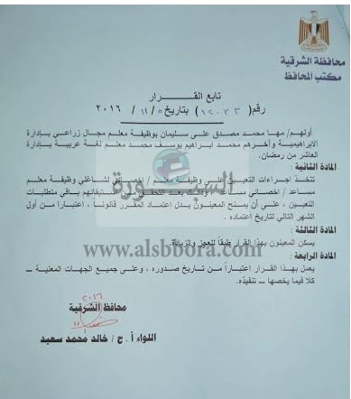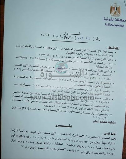 ننشر قرار تعيين الـ 75 الف علي درجة معلم بمحافظة الشرقية