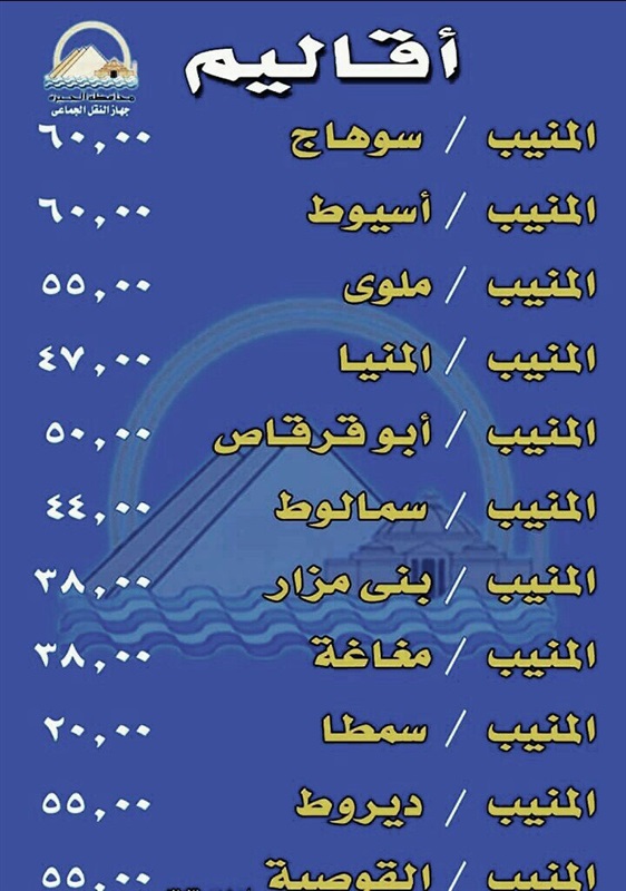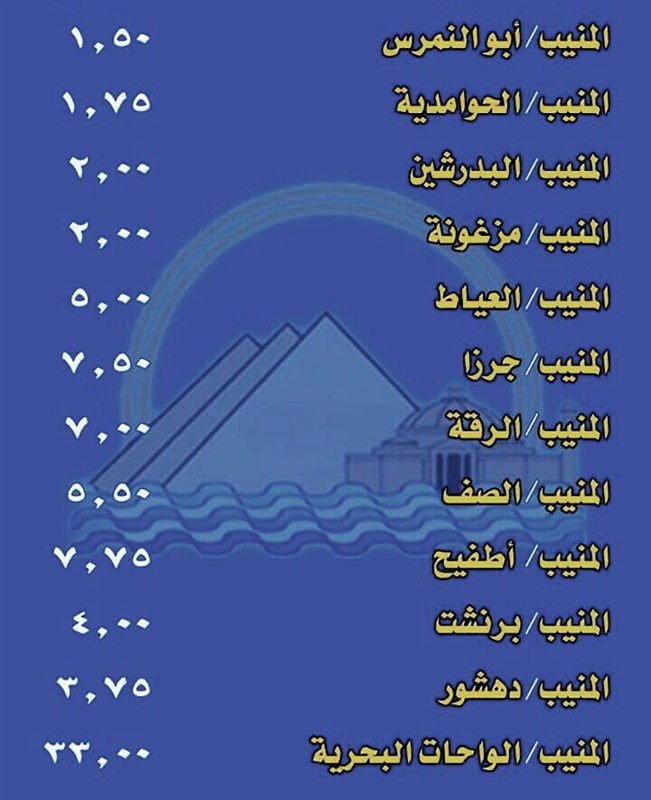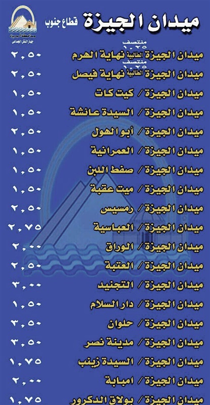 قامت محافظة الجيزة، بالتعاون مع جهاز النقل الجماعى والسرفيس داخل المحافظة، بنشر أسعار التعريفة الجديدة لسيارات الأجرة للخطوط الداخلية والأقاليم.