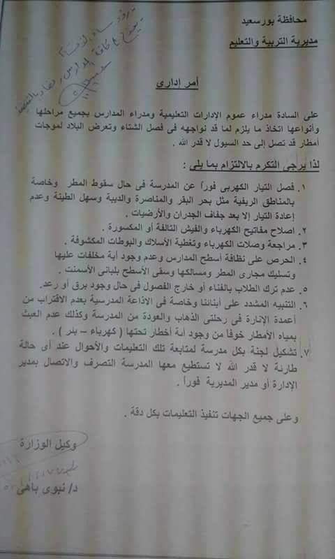 صرح الدكتور نبوي باهي وكيل وزارة التربية والتعليم ببورسعيد انه اصدر أوامر عاجلة لكل مديري المدارس والإدارات التعليمية بالمحافظة لاتخاذ اللازمة لمواجهه فصل الشتاء وتعرض البلاد لموجات أمطار قد تصل إلى حد السيول.