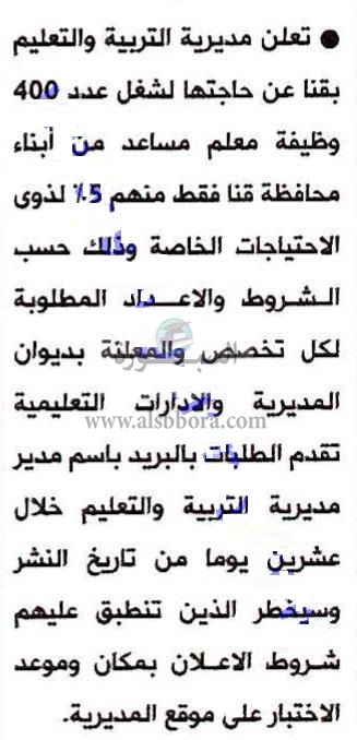 أعلنت وزارة التربية والتعليم عن وظائف جديدة للمعلمين المساعدين وذلك وفقا لنص الإعلان التالي: