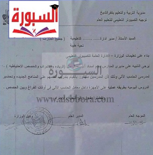 ارسلت مديرية التربية والتعليم بكفر الشيخ الى جميع الادارات بعدم اسناد مدرسى الحاسب الآلى باى اعمال مثل "الريادة والاشراف والحصص الاحتياطية"، وذلك لأن المدرسين مكلفون بالقيام بتدريب أنفسهم على المناهد الجديدة وتحضير الدروس اليومية بطريقة عملية على الاجهزة داخل معامل الحاسب الآلى فى أوقات الفراغ وبين الحصص.