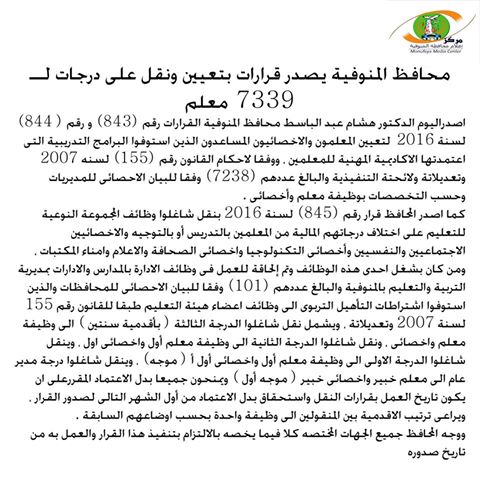أصدر الدكتور هشام عبدالباسط محافظ المنوفية القرارين 843 و 844 لترقية 7238 من شاغلي وظيفة معلم مساعد إلى وظيفة معلم وذلك بعد حصولهم على شهادة الصلاحية و استيفائهم كافة الشروط و الضوابط المطلوبة للتعيين على وظيفة معلم .