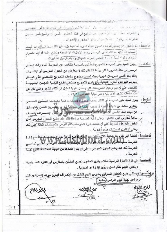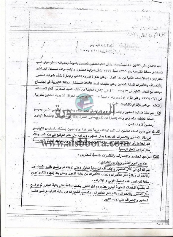بالمستندات| "التعليم" تعلن مواعيد الحضور والانصراف للمعلمين فى المدارس: الحضور قبل بدء الطابور.. والتأخيرات بعد نهايته بربع ساعة لمن ليس عنده الحصة الأولى أو الاشراف