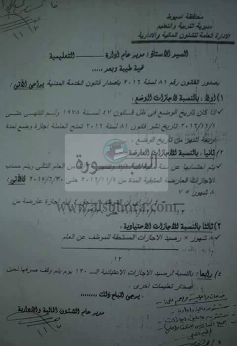 ارسلت مديرية التربية والتعليم بمحافظة اسيوط الى الادارت التعليمية منشورا بشأن كيفية احتساب الاجازات العارضة والاعتيادية، وننشر الفاكس الوارد من المديرية.