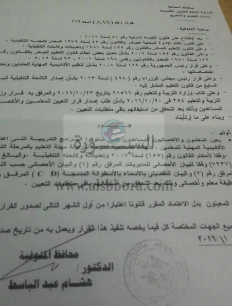 ننشر قرار رقم 844 لمحافظة المنوفية بشأن تعيين المعلمين المساعدين والاخصائيين الى درجة معلم