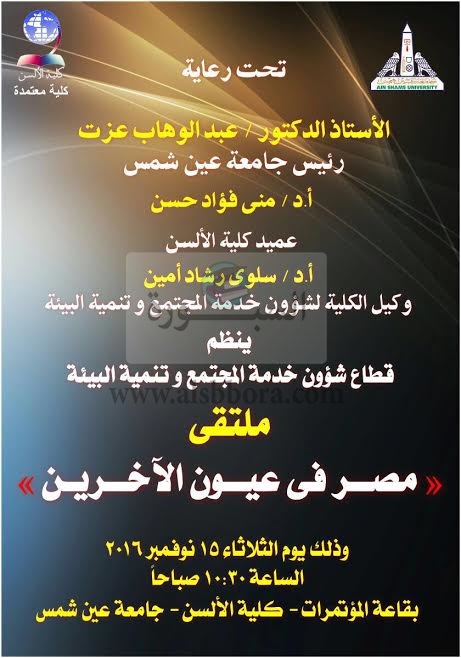 ينظم قطاع خدمة المجتمع و تنمية البيئة بكلية الألسن جامعة عين شمس ملتقي الأدبي الأول بعنوان "مصر في عيون الأخرين " ضمن فعاليات الأنشطة الخدمية التى تقدمها جامعة عين شمس لأبنائها من الطلاب تحت رعاية أ.د.عبد الوهاب عزت رئيس الجامعة ، أ.د.منى فؤاد عميد الكلية ، وذلك في تمام العاشرة و النصف من صباح الثلاثاء الموافق 15 من نوفمبر الجاري بقاعة مؤتمرات الكلية ، صرح بذلك أ.د.سلوى رشاد وكيل الكلية لشئون القطاع .