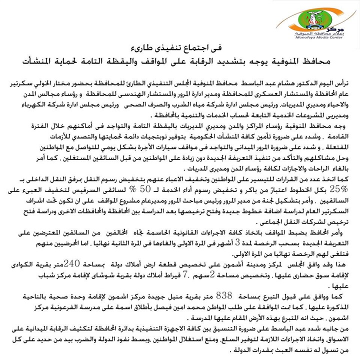 شدد الدكتور هشام عبدالباسط محافظ ا لمنوفية على ضرورة التنسيق بين كافة الأجهزة التنفيذية بدائرة المحافظة لتكثيف الرقابة الميدانية على الأسواق واتخاذ الأجرأت الازمة لتوفير السلع ومنع استغلال المواطنين فيما يلى صورة من اهم ماجاء بالاجتماع