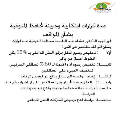 محافظ المنوفية يوجه بتشديد الرقابة على المواقف واليقظة التامة لحماية المنشأت