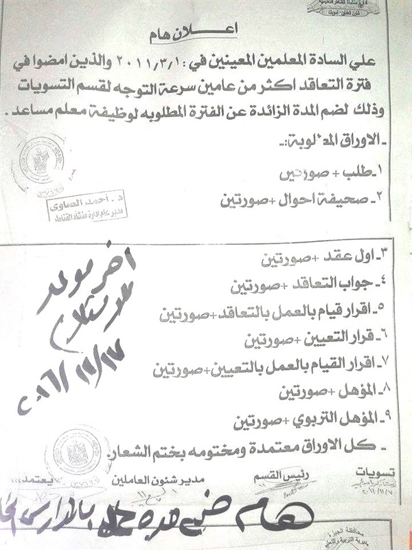 على ان يتم اعتماد جميع الاوراق المطلوبة وتقديمها لقسم التسويات بالادارة لاجراء الضم لجميع المعلمين المعينين فى مارس 2011 على درجة معلم والذين سبق ان عملوا بالتعاقد سنتين او ثلاثة قبل فترة المعلم المساعد