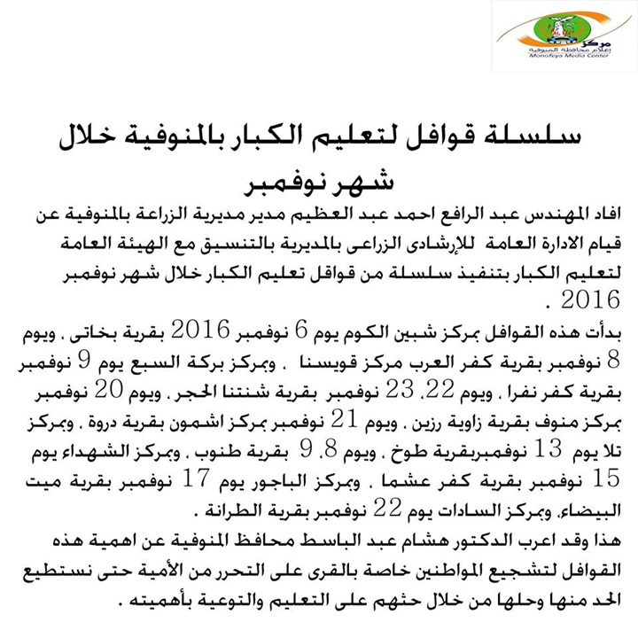 تطلق الادارة العامة للارشاد الزراعى بمديرية الزراعة بالمنوفية بالتنسيق مع الهيئة العامة لتعليم الكبار سلسلة من القوافل والندوات فى مجال محو الأمية وتعليم الكبار برعاية الدكتور هشام عبد الباسط محافظ المنوفية واشراف المهندس عبد الرافع أحمد عبد العظيم مدير مديرية الزراعة بالمنوفية