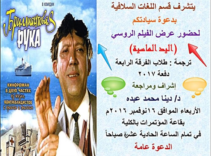 قام قسم اللغة الروسية بكلية الألسن بترجمة الفيلم السينمائي الروسي "اليد الماسية" إلي اللغة العربية للعام الثاني علي التوالي ، والذي يعتبر أحد أبرز الأفلام الروسية الكوميدية المحببة والشهيرة لدي الشعب الروسي. تمت الترجمة تحت اشراف أ.د. دينا محمد عبده الأستاذ المساعد بالقسم ، وسيتم عرضه في تمام الحادية عشر صباحًا يوم الأربعاء الموافق 16 من نوفمبر الجاري بقاعة مؤتمرات الكلية .