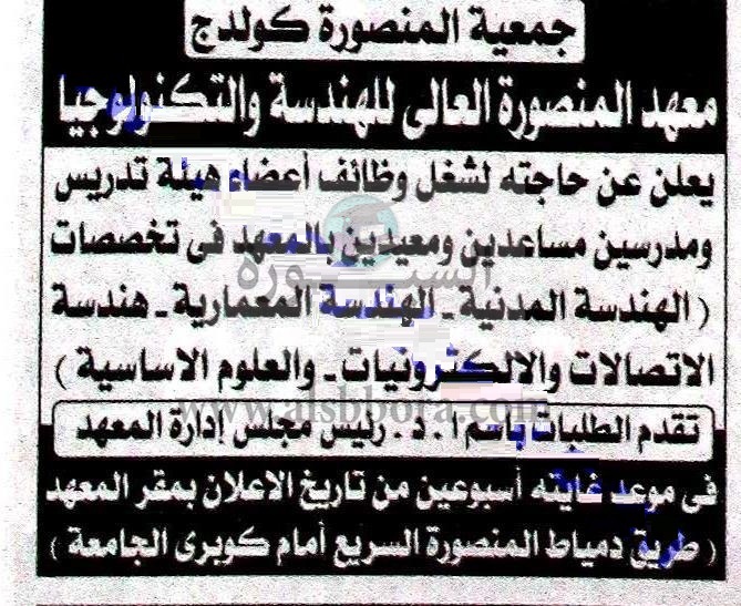 معهد المنصورة العالي يعلن عن وظائف جديدة لأعضاء هيئة التدريس"من معيد الي أستاذ".. ننشر نص الإعلان