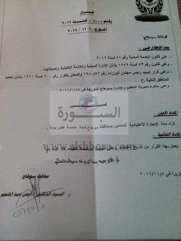أصدر الدكتور أيمن محمد عبد المنعم محافظ سوهاج قراره رقم 955 لسنة 2016 بالموافقة على زيادة الإجازة الاعتيادية للعاملين بالوحدات الإدارية بالمحافظة 15 يومًا بدلا من 7 أيام اعتبارا من 10 نوفمبر.