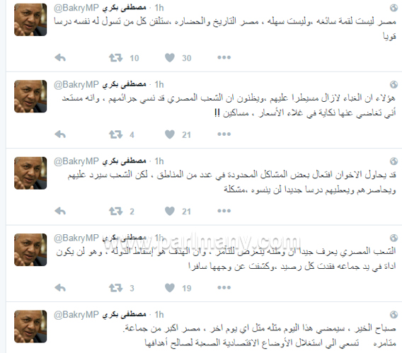 وقال بكرى، سلسلة في تغريدة علي حسابه على موقع التدوين العالمي "تويتر"، قائلاً: " سيمضى هذا اليوم مثله مثل أى يوم آخر، مصر أكبر من جماعة متآمره تسعى إلى استغلال الأوضاع الاقتصادية الصعبة لصالح أهدافها".