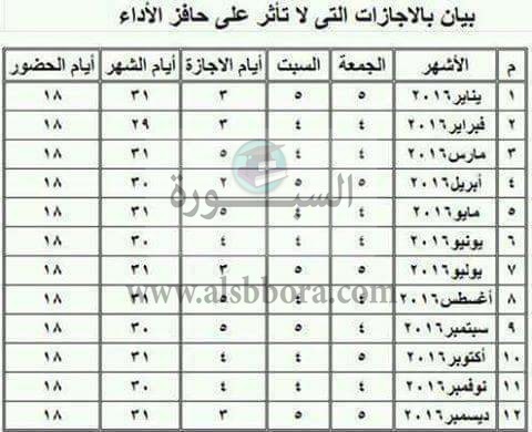 ينشر موقع السبورة بيان تفصيلى بالاجازات التى لا تؤثر على حافز الآداء خلال عام 2016.