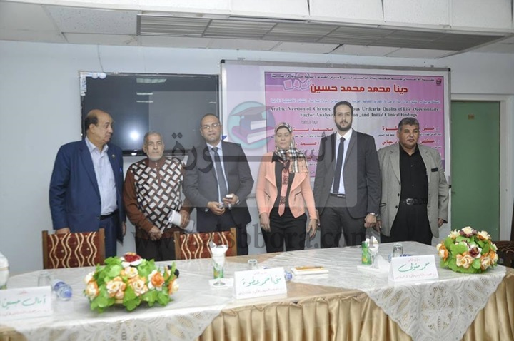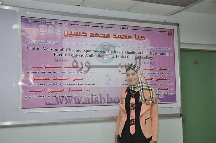 ناقشت الطبيبة دينا محمد محمد حسين أحدث رسالة ماجيستير في الأمراض الجلدية و التناسلية في كلية الطب جامعة قناة السويس وكانت رسالتها عن (دراسة عن النسخة العربية من استبيان جودة حياة مرضى الأرتكاريا التلقائية المزمنة : تحليل العوامل، مدى الصلاحية، النتائج الأكلينيكية الأولية وحصلت الطبيبة على درجة الماجستير .