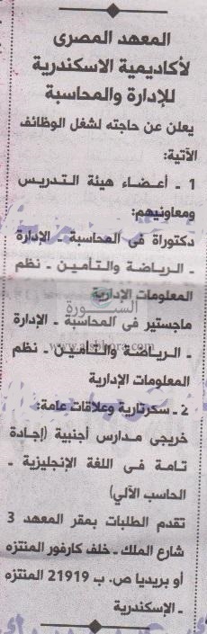 يعلن المعهد المصرى لاكاديمية الاسكندرية للادارة والمحاسبة عن حاجته لشغل وظائف أعضاء هيئة التدريس، على أن تقدم الطلبات بمقر المعهد 3 شارع الملك، خلف كارفور المنتزه، الاسكندرية.