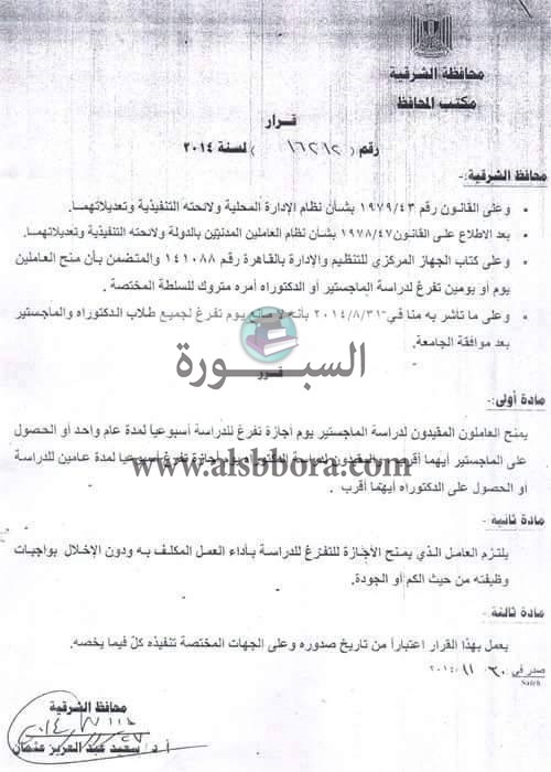 ننشر نص القرار الخاص بمنح العاملين بالدولة المقيدين بدراسة الماجستير يوم إجازة أسبوعيا للتفرغ للدراسة