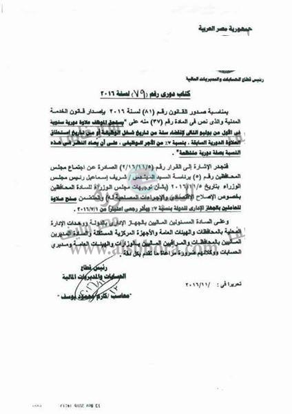 أصدرت وزارة المالية الكتاب الدوري رقم 79 لسنة 2016، وذلك لتنظيم عملية صرف العلاوة الدورية المقررة للعاملين بالجهاز الإداري للدولة والخاضعين لقانون الخدمة المدنية رقم 81 لسنة 2016.
