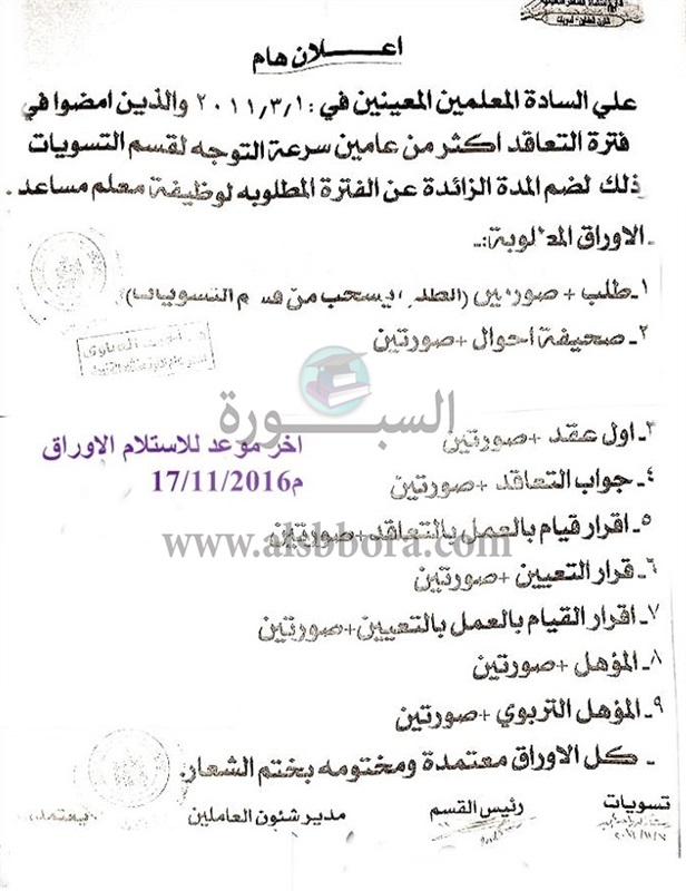 خاطبت وزارة التربية والتعليم المعلمينم المعينين فى أول مارس 2011 والذين امضوا فترة التعاقد أكثر من عامين سرعة التوجه لقسم التسويات ذلك لضم المدة الزائجه عن الفترة المطوبة لوظيف معلم مساعد، ويتم نشر الأوارق المطوبة كما يلى: