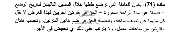 وجاءت الاجابة كالتالى: أفاد الحسين محمد منصور الجعفري بإنه ليس من حقه لأن ساعة الرضاعة نص عليها القانون وما صدر بقانون لا يلغيه الا قانون مثله، والمادة رقم 71 من قانون الطفل رقم 12 لسنة 1996 م المعدل بالقانون رقم 126 لسنة 2008 م، نصت على التالى: