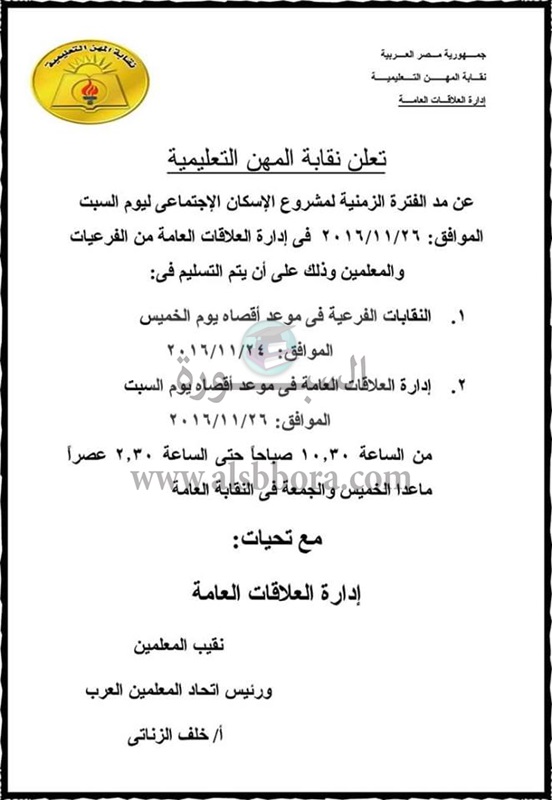 اعلنت نقابة المهن التعليمية عن مد فترة الزمنية للاسكان الاجتماعى ليوم السبت الموافق 26 - 11- 2016 فى ادارة العلاقات العامة من الفرعيات والمعلمين على ان يتم التسليم فى النقابات الفرعية بموعد اقصاه يوم الخميس 24 نوفمبر 2016 ، وادارة العلاقات العامة فى موعد اقصاه 26 نوفمبر 2016 من الساعه 10 صباحا للساعه 2 ظهرا