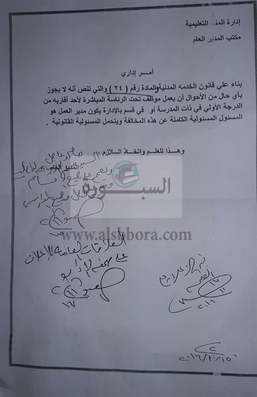 أرسلت ادارة المنيا التعليمية أمر ادارى الى جميع المدارس بشأن المادة رقم 24، من قانون الخدمة المدنية، والتى تنص بأنه لايجوز باى حال من الاحوال أن يعمل موظف تحت الرئاسة المباشرة لأحد أقاربه من الدرجة الأولى فى ذات المدرسة أو فى قسم بالادارة يكون مدير التعمل هو المسئول المسئولية الكاملة عن هذه المخالفة ويتحمل المسئولية القانونية.