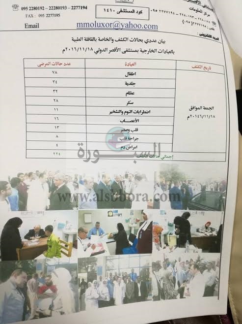 واوضح السيد ان القافلة الطبية كانت بناء على توجيهات من محمد بدر محافظ الاقصر اثناء تجهيزات فعاليات المؤتمر و بالفعل تم تطبيق الفكرة حيث تم الكشف على الحالات من قبل نخبة من اساتذة الجامعات المصرية فى تخصصات الطب المختلفة حيث تم الكشف على 224 حالة مقسمة كالاتى 78 اطفال ، 34 جلدية ، 32 عظام ، 28 سكر ، 11 اضطرابات النوم والتشخير ، 16 اعصاب ، 13 قلب وصدر ، 8 جراحات قلب ، 4 أمراض الدم .