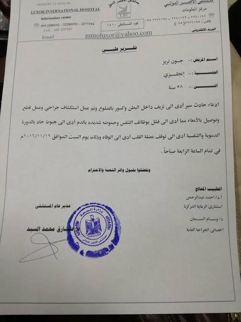 اوضح الدكتور طارق محمد السيد مدير عام المستشفى الدولى بالاقصر انه وصلت الحالة إلى المستشفى فجر اليوم فى حالة خطيرة حيث كان يعانى من نزيف داخل البطن وكسور للضلوع وتم عمل استكشاف جراحى وعمل قطع وتوصيل بالامعاء الامر الذى ادى إلى فشل بوظائف التنفس وحموضة شديدة بالدم ادى إلى هبوط حاد فى الدورة الدموية والتنفسية مما ادى الى توقف عضلة القلب ووفاة المريض .