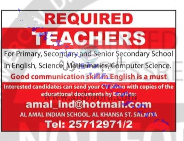 تعلن احدى المدارس الكبرى بدولة الكويت عن حاجتها الى معلمين، لمرحلتى الابتدائية والثانوية، وعلى الراغبين فى التقدم ارسال السيرة الذاتية عبر الاعلان المنشور أدنى الخبر.
