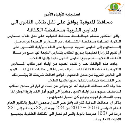 قرر الدكتور هشام عبد الباسط ، محافظ المنوفية ، بناء على طلب اولياء الامور بنقل طلاب الثانوي بمدارس منخفضة الكثافة من المدارس البعيدة عن محل اقامتهم الى مدارس قريبة من محل سكنهم