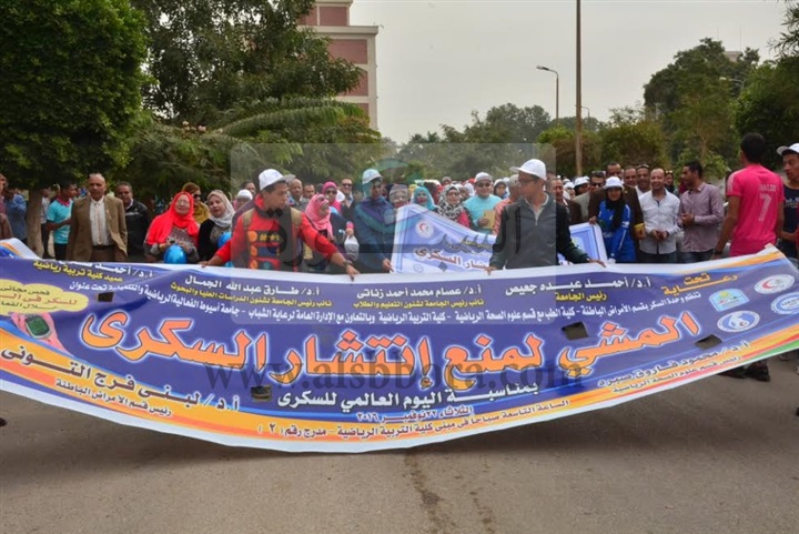 ومن جانبه أوضح الدكتور أحمد صلاح قراعة إن المارثون يهدف إلى التشجيع على ممارسة الرياضة ,والتوعية بأمراض السكر ومضاعفته وفوائدها على صحة الإنسان ويشارك في المارثون أكثر من 300 طالب وطالبة من كلية التربية الرياضية وطلاب الجامعة على مستوى الكليات ، موضحا أن المارثون يعقبه محاضرات تثقفيه بمقر كلية التربية الرياضية يحاضر فيها أساتذة الغدد الصماء والسكر والباطنة وأساتذة التربية الرياضية، ومنها محاضرة للدكتور عماد شعبان أستاذ فسيولوجيا الرياضة حول الرياضية وفوائدها على صحة الإنسان ،ومحاضرة للدكتور لبنى التونى حول التوعية بمرض السكر وكيفية الحد من انتشاره.
