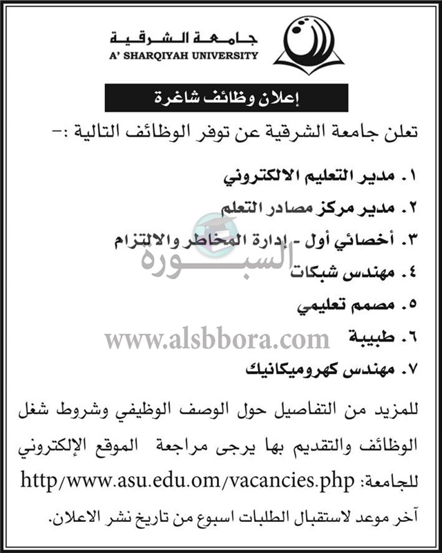 تعلن جامعة الشرقية بسلطنة عمان عن حاجتها الى وظائف شاغرة لحملة المؤهلات العليا وعلى الراغبين فى التقدم التواصل عبر موقع الجامعة والرابط المنشور فى الاعلان التالى: