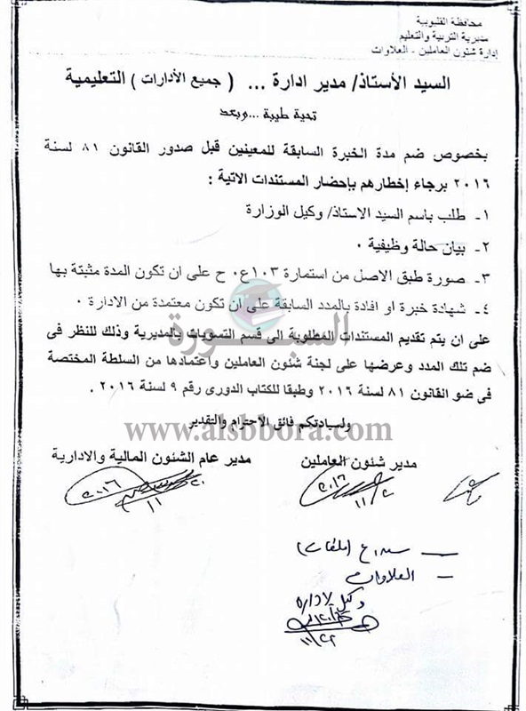 ينشر موقع السبورة فاكسا صادر من مديرية التربية والتعليم بمحافظة القليوبية إلى جميع الادارات التعليمية بشأن ضم مدة الخبرة السابقة لمعلمين والاداريين المعينين قبل صدور القانون رقم 81 لسنة 2016، يخطرهم بإحضار المستندات الآتية: