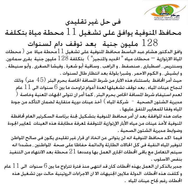 فى حل غير تقليدى محافظ المنوفية يوافق على تشغيل 11 محطة مياة بتكلفة 128 مليون جنية بعد توقف دام لسنوات