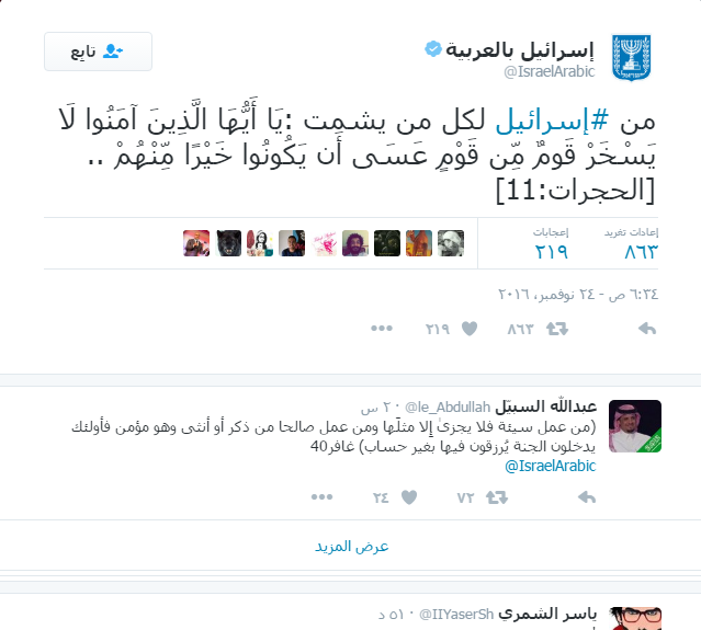 واختار المسئول عن الحساب الرسمي لدولة إسرائيل آية قرآنية من سورة الحجرات للرد على تعليقات الحريق، قائلا: "من #إسرائيل لكل من يشمت: يَا أَيُّهَا الَّذِينَ آمَنُوا لَا يَسْخَرْ قَومٌ مِّن قَوْمٍ عَسَى أَن يَكُونُوا خَيْرًا مِّنْهُمْ .. [الحجرات - 11]".