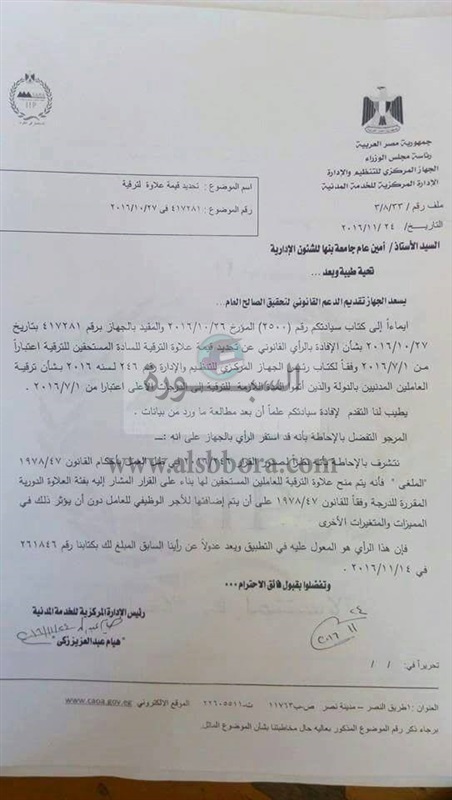 ينشر موقع السبورة كتاب الجهاز المركزي للتنظيم والادارة إلى أمين عام جامعة بنها للشئون الادارية بشأن قيمة علاوة الترقية للسادة المستحقين للترقية اعتباراً من 1-7-2016م تمنح بفئة العلاوة الدورية المقررة للدرجة وفقا لأحكام القانون رقم 47 لسنة 1978م وتعديلاته نظراً لصدور قرار رئيس الجهاز المركزي للتنظيم والادارة رقم 246 لسنة 2016م في ظل العمل بأحكام القانون رقم 47 لسنة 1978م.