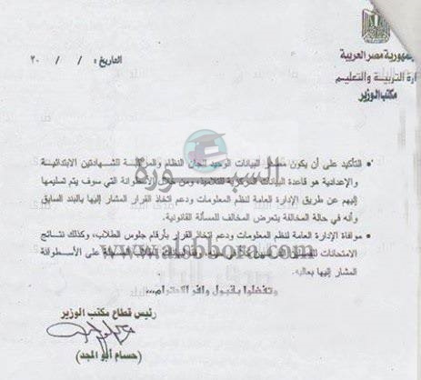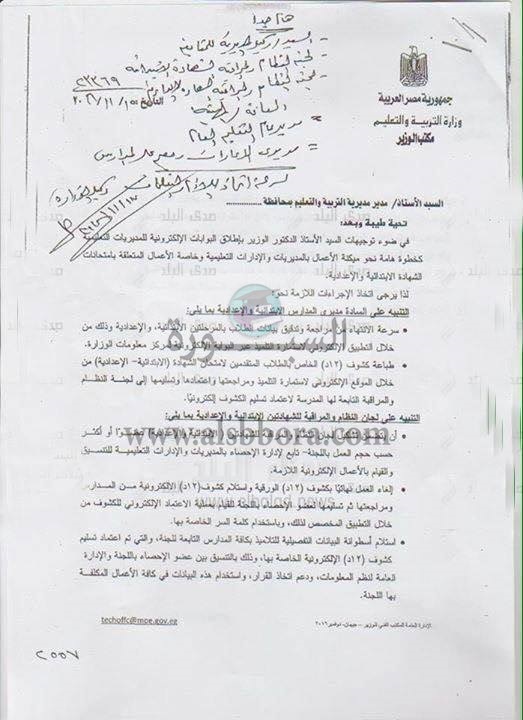 وجهة وزارة التربية والتعليم مديرى المدارس بسرعة طباعة كشوف 12 د من موقع الوزارة للتلاميذ المتقدمين لامتحانات الشهادة الإبتدائية والإعدادية.