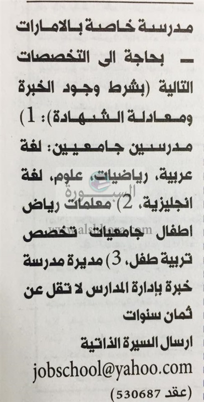 تعلن كبرى المدارس الخاصة بدولة الامارات العربية المتحدة عن حاجتها الى معلمين ومعلمات، وعلى الراغبين فى التقدم ارسال السيرة الذاتية المنشور عبر الاعلان التالى: