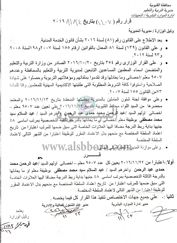 اعلنت مديرية التربية والتعليم بمحافظة القليوبية عن تعيين 9507 معلم واخصائى اولهم: عبدالرحمن محمد حمدى عبدالرحمن وآخرهم عبدالسلام سيد محمد مصطفى بوظيفة معلم أو ما يعادلها بالدرجة الثالثة التخصصية براتب اساسى 48 جنيها بداية ربط الدرجة، مضافا اليها العلاوات الخاصة التى سبق ضمها للراتب اعتبارا من تاريخ اعتماد السلطة المختصة مع منهحم بدل الاعتماد المقرر للوظيفة اعتبارا من الشهر التالى لاعتماد السلطة المختصة.