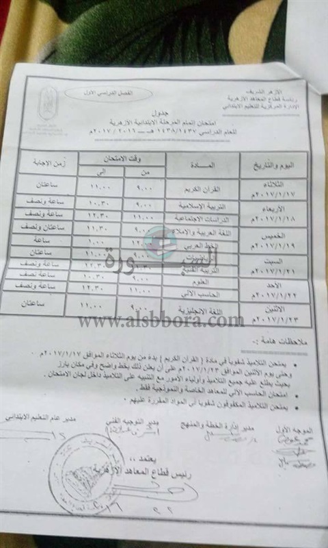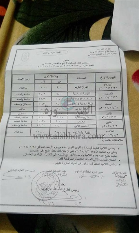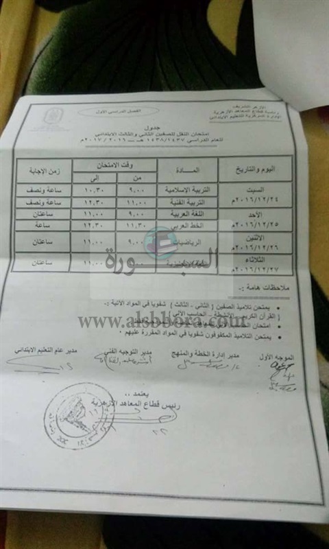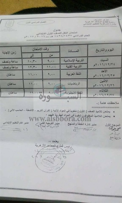 ينشر موقع السبورة جداول امتحانات النقل الابتدائي والشهادة الابتدائية الازهر الشريف 2017/2016