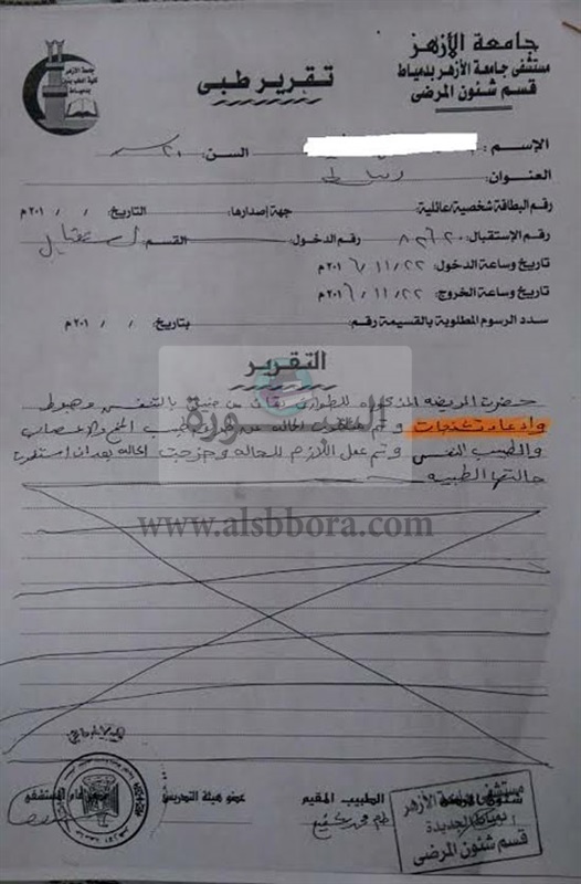 وكشف التقرير الطبى الذى حصل "السبورة" على صورة ضوئية منه أن الطالبة حضرت إلى المستشفى يوم 22 نوفمبر الجارى ودخلت قسم الطوارئ تعانى من ضيق فى التنفس وهبوط وإدعاء تشنجات وتم مناظرة الحالة عن طريق طبيب المخ والأعصاب والطبيب النفسى وتم عمل اللازم للحالة وغادرت المستشفى بعد استقرار حالتها.