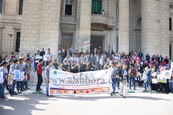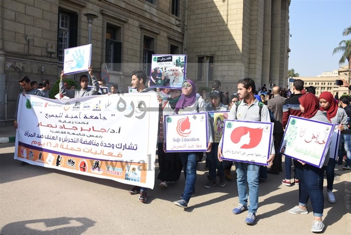 شارك الدكتور جابر نصار رئيس جامعة القاهرة فى مسيرة مناهضة للتحرش والعنف ضد المرأة، جابت أرجاء جامعة القاهرة، بحضور نواب رئيس الجامعة والأساتذة والطلاب،وعدد من ممثلي المجتمع وهيئة الأمم المتحدة للمرأة والمجلس القومي للمرأة، ومدير وحدة مناهضة التحرش الدكتور مها السعيد وفرقة موسيقية من الشباب، وذلك فى إطار مشاركة جامعة القاهرة فى اليوم العالمى لمناهضة العنف ضد المرأة برعاية الأمم المتحدة "حملة الـ 16 يوما"، حيث انطلقت المسيرة من أمام قبة الجامعة فى الثانية عشر ظهرًا، وجابت أرجاء الجامعة.