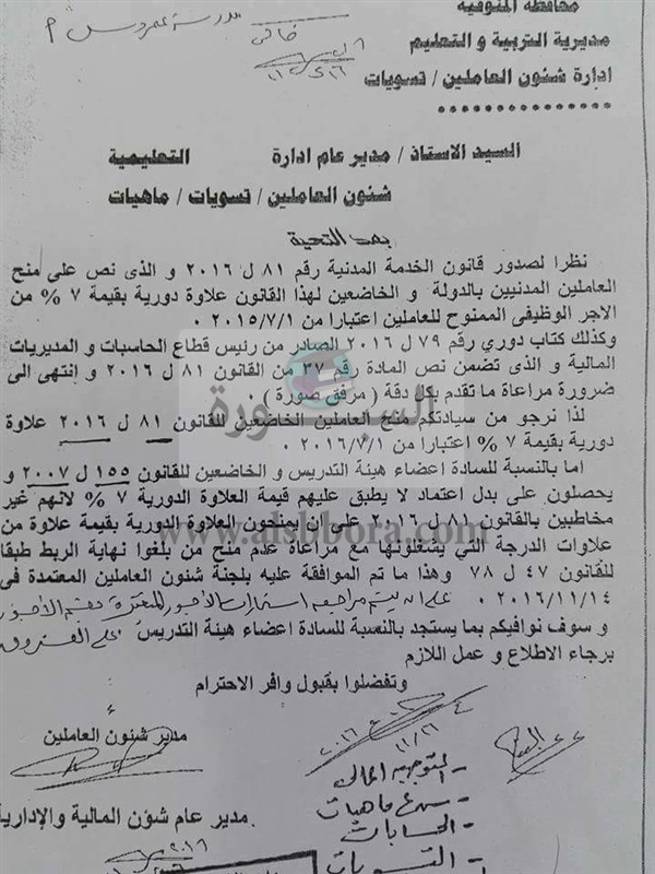 بالمستندات| حرمان المعلمين من العلاوة 7%.. ووزارة المالية تتعامل مع المعلمين بالقانون 47 لسنة 1978 الملغى